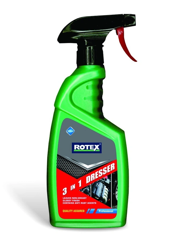 Rotex 3 in 1 Dresser Spray 500 ml is a versatile car care solution that cleans, shines, and protects in one easy application. Specially formulated for plastic, vinyl, and rubber surfaces, it restores the natural look while leaving a smooth, non-greasy finish. Enriched with protective agents, it prevents fading, cracking, and dullness caused by sun exposure and daily wear. Its convenient spray bottle ensures quick, even application—perfect for both professional detailers and everyday car owners.