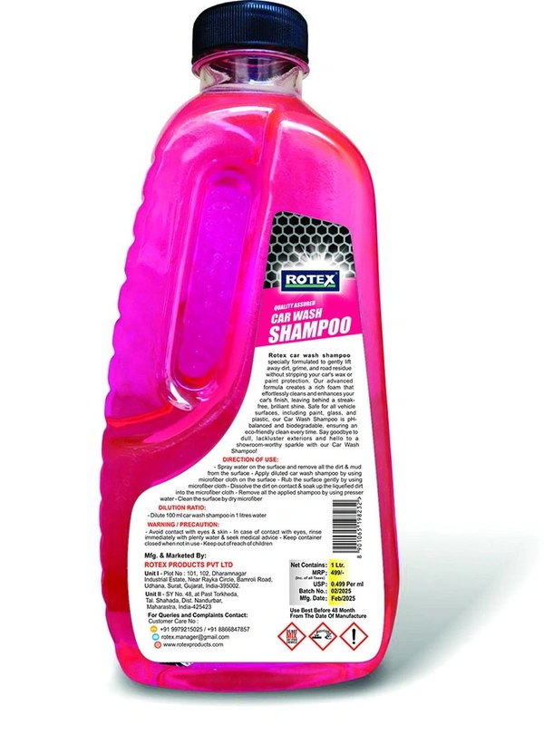 Rotex Car Wash Shampoo is a high-quality automotive cleaning solution designed to deliver a sparkling, streak-free finish every time you wash your vehicle. Specially formulated with anti-rust agents, it not only removes dirt, grease, and road grime effectively but also helps protect your car’s surface from corrosion. Its rich foaming action provides a non-greasy, glossy finish that keeps your car looking fresh and well-maintained. Ideal for both professional detailers and everyday car owners, this shampoo ensures a fast, easy, and effective car wash experience.